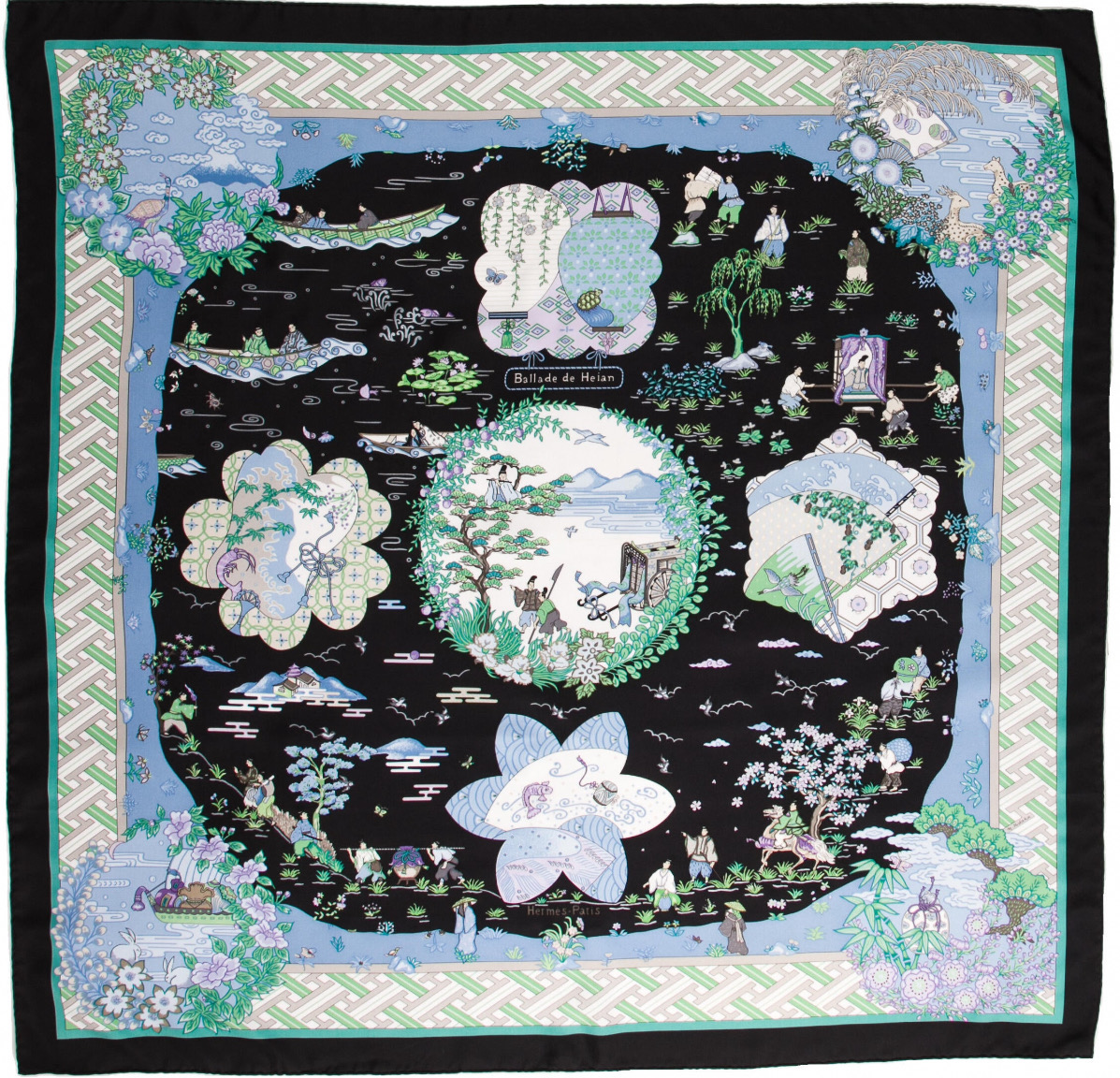 Composed with all the delicacy of harmonious music, the carre expresses the elegance of the Heian period (from the eigth to the twelfth century), a fruitful era for the arts in Japan. Bordered by a traditional geometric design, the central tableau and the accompanying scenes pick up themes recurrent in Japanese prints: Mount Fuji in its clouds, travellers on horseback, in palanquins or in boats, accompanied by porters... Four medallions link the stylised flowers, patterns and typical fans found on kimonos. The abundance of cherry-trees, weeping willows, peonies, and peach blossom, recalls the refined settings of Japanese gardens.