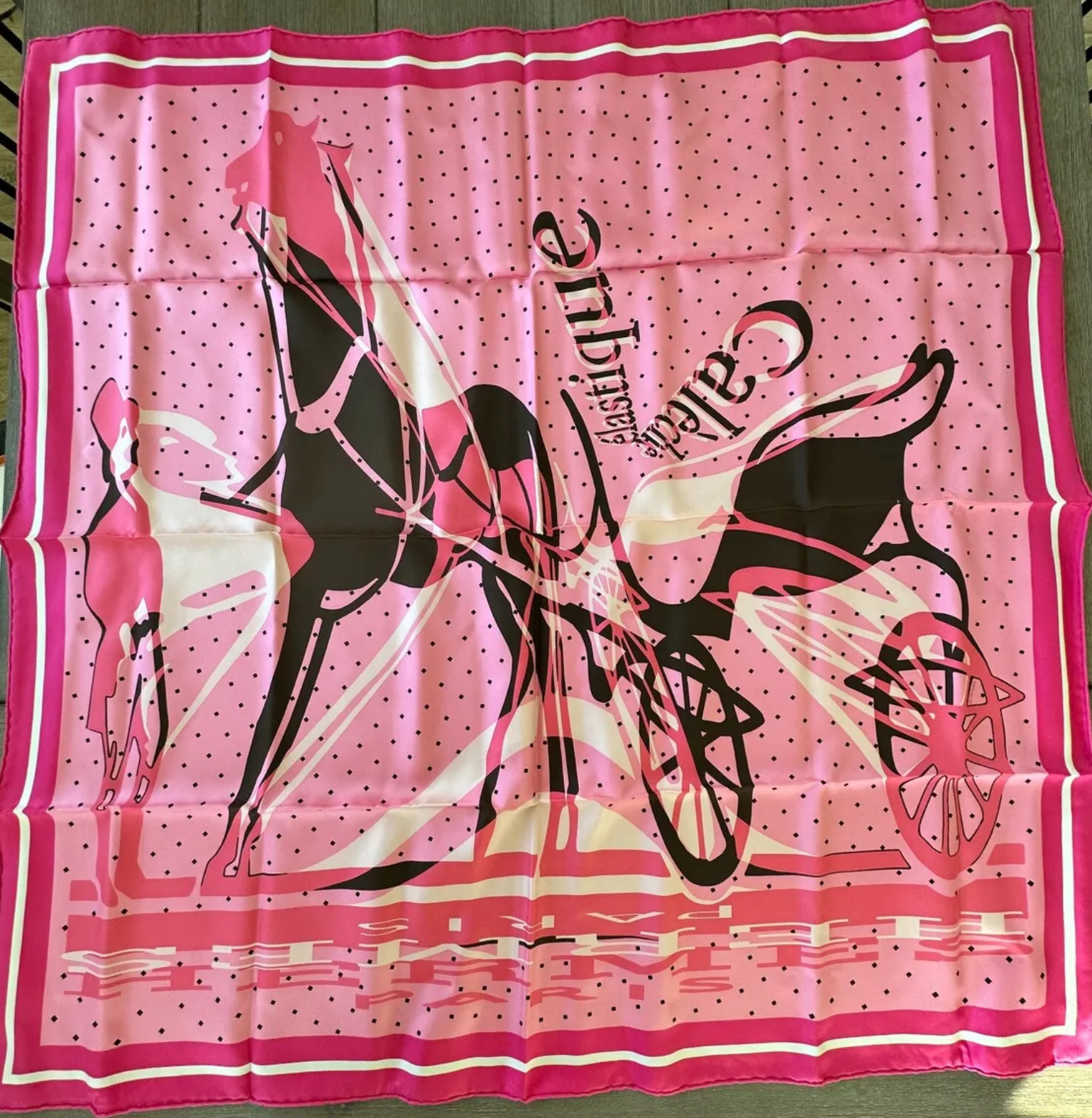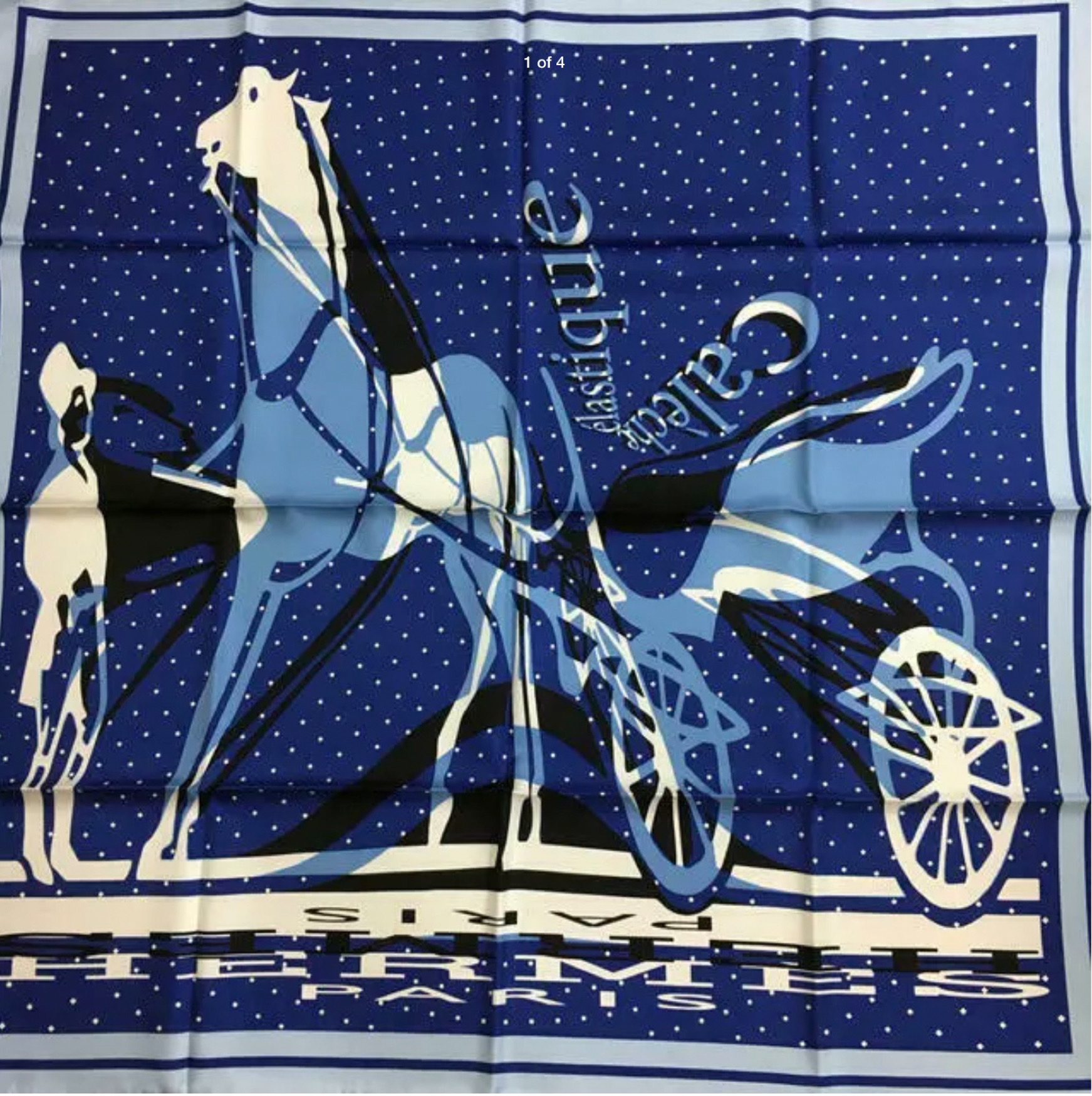 The caleche and its groom, an emblematic Hermes image, becomes elastic! By means of transformation, distortion and metamorphosis, the image is deformed, stretched and refined. The long-necked, long-legged horse pulls a curious carriage. The elegant silhouette of the groom, meanwhile, is reproduced in an enigmatic shadow. As if reflected in a distorting mirror, this transfigured design is full of surprises!