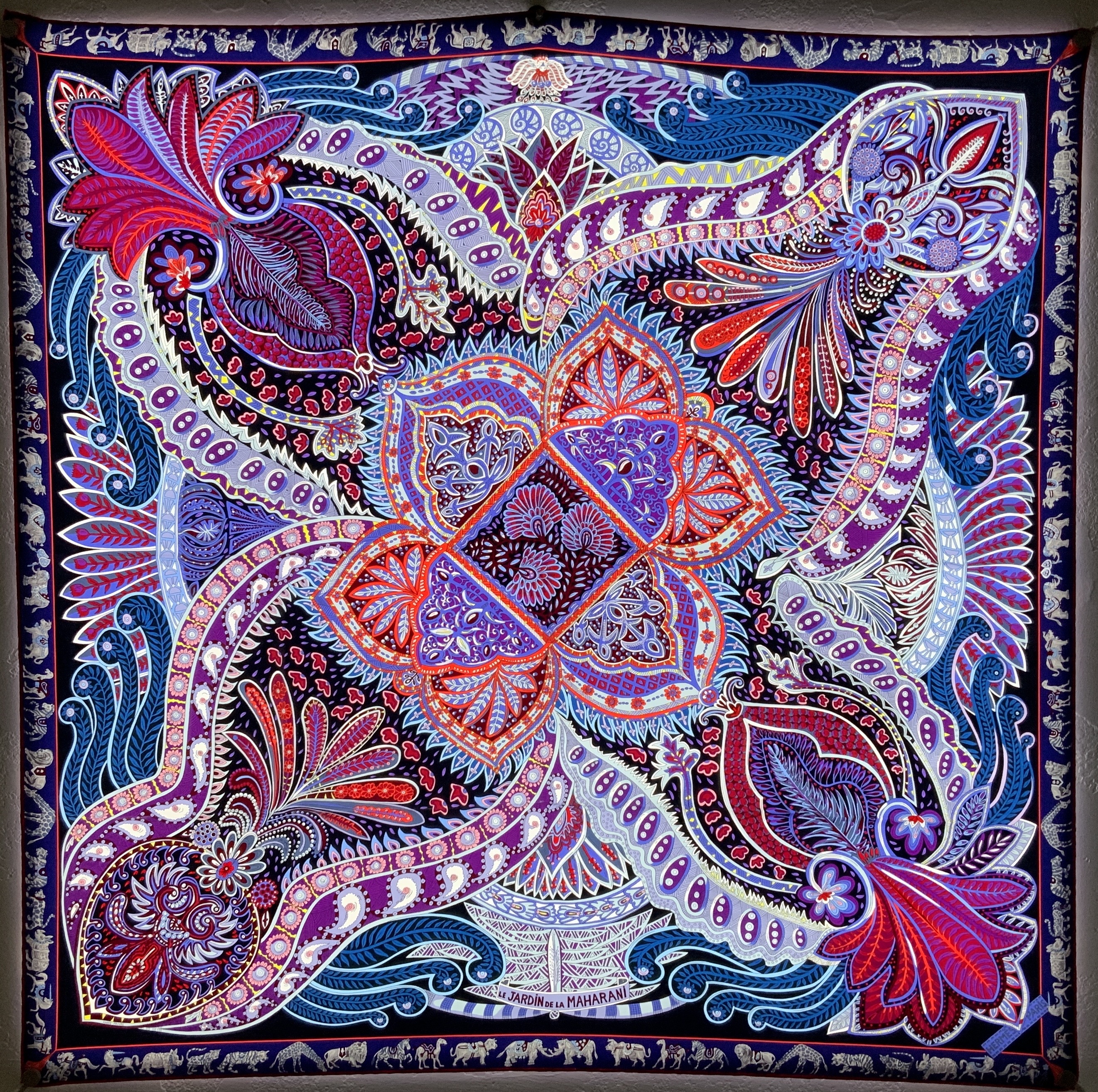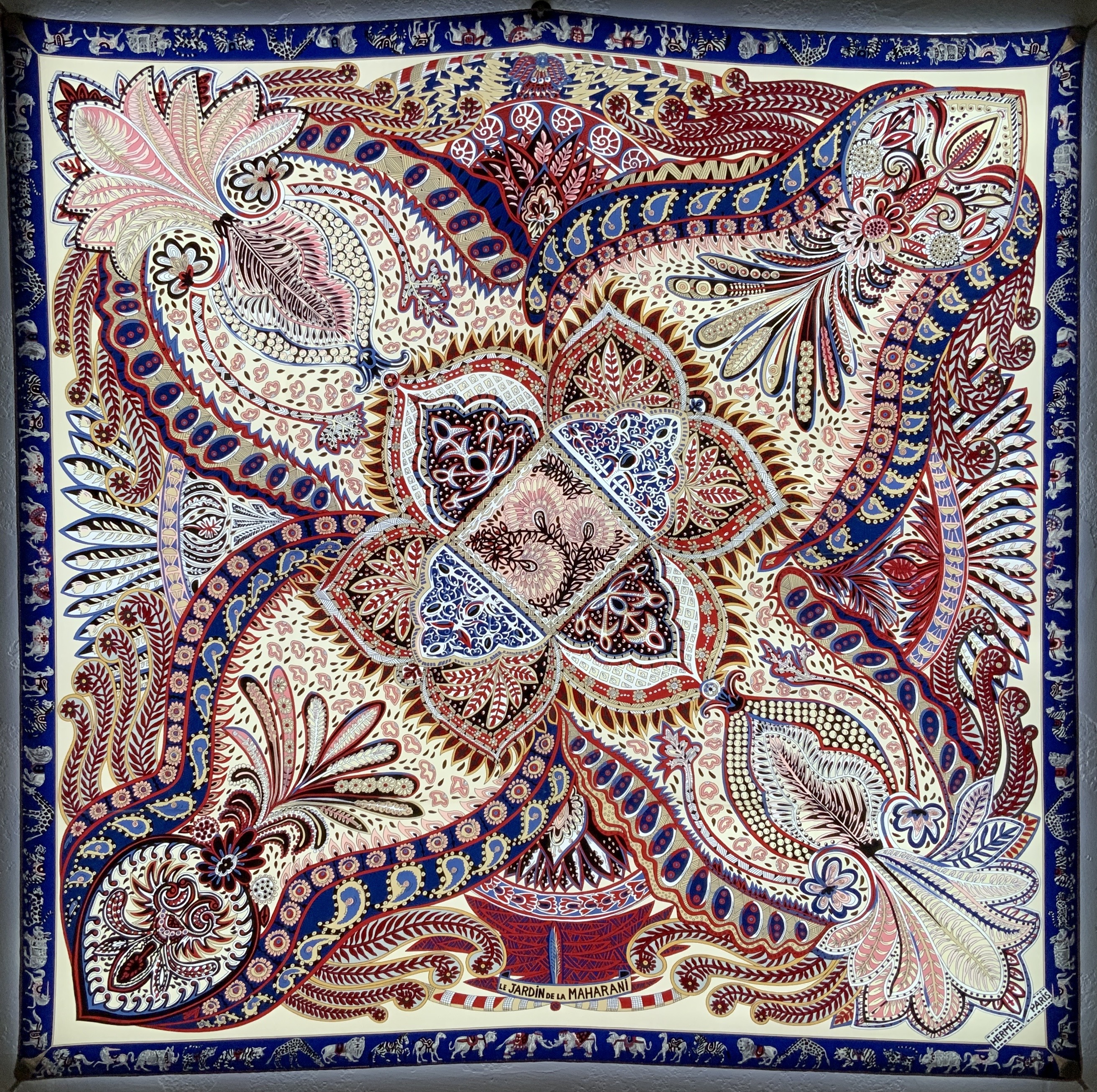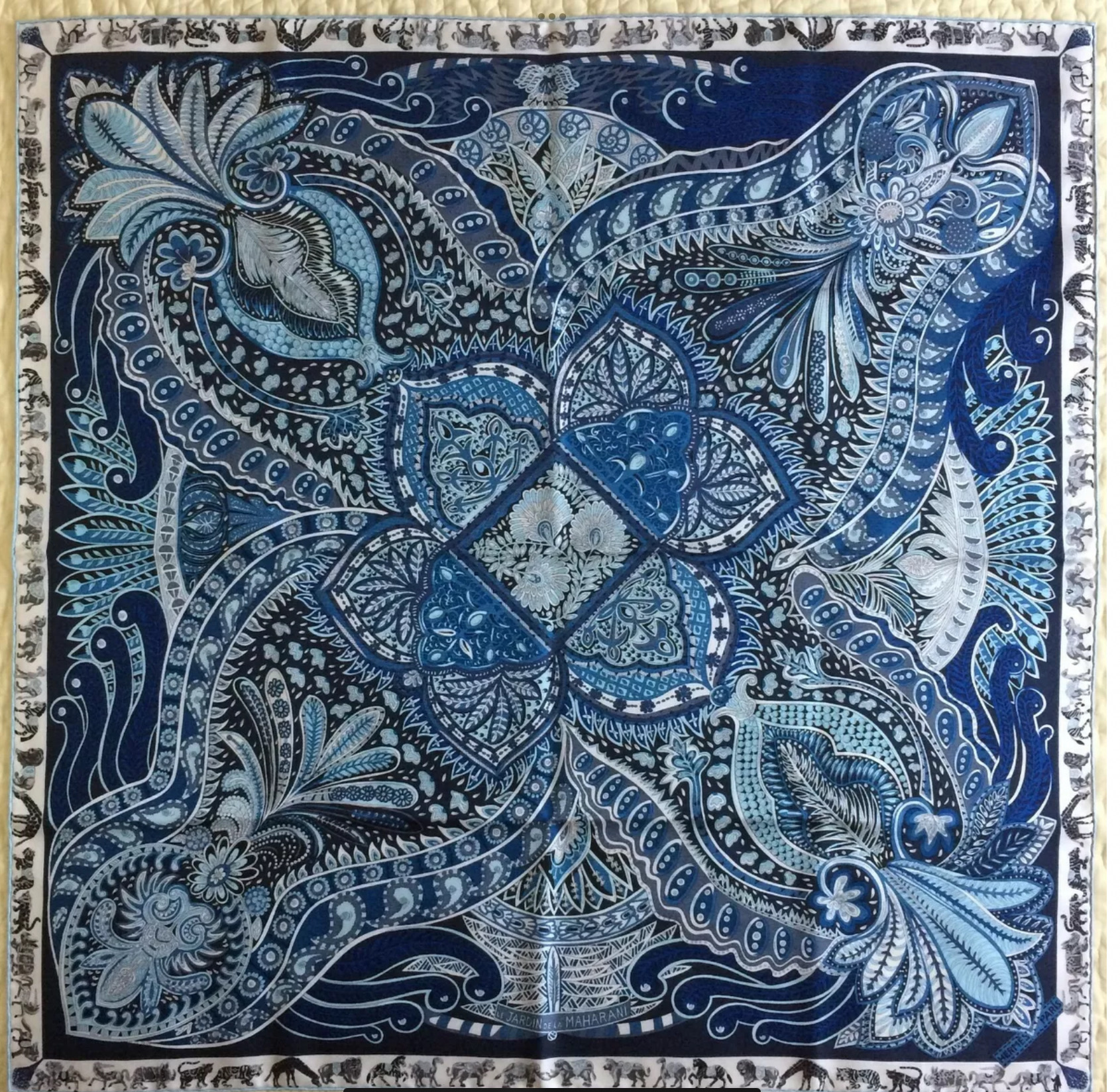 Freely inspired by Mughal motifs, this scarf is dedicated to the Maharani of Jaipur, born Princess Gayatri Devi of Cooch Behar, the third wife of the Maharaja Sawai Man Singh II. Her tastes and culture were equally inspired by India and Europe. She marked her time through her political engagement and her determination to bring education to Indian women. At the beginning of the 1940s she created the girls' school that bears her name. Twenty years later she became a Member of Parliament, elected by the largest majority in Indian history. The Maharani of Jaipur loved nature and gardens. With this scarf, Annie Faivre wanted to pay homage to her by "offering her flowers".