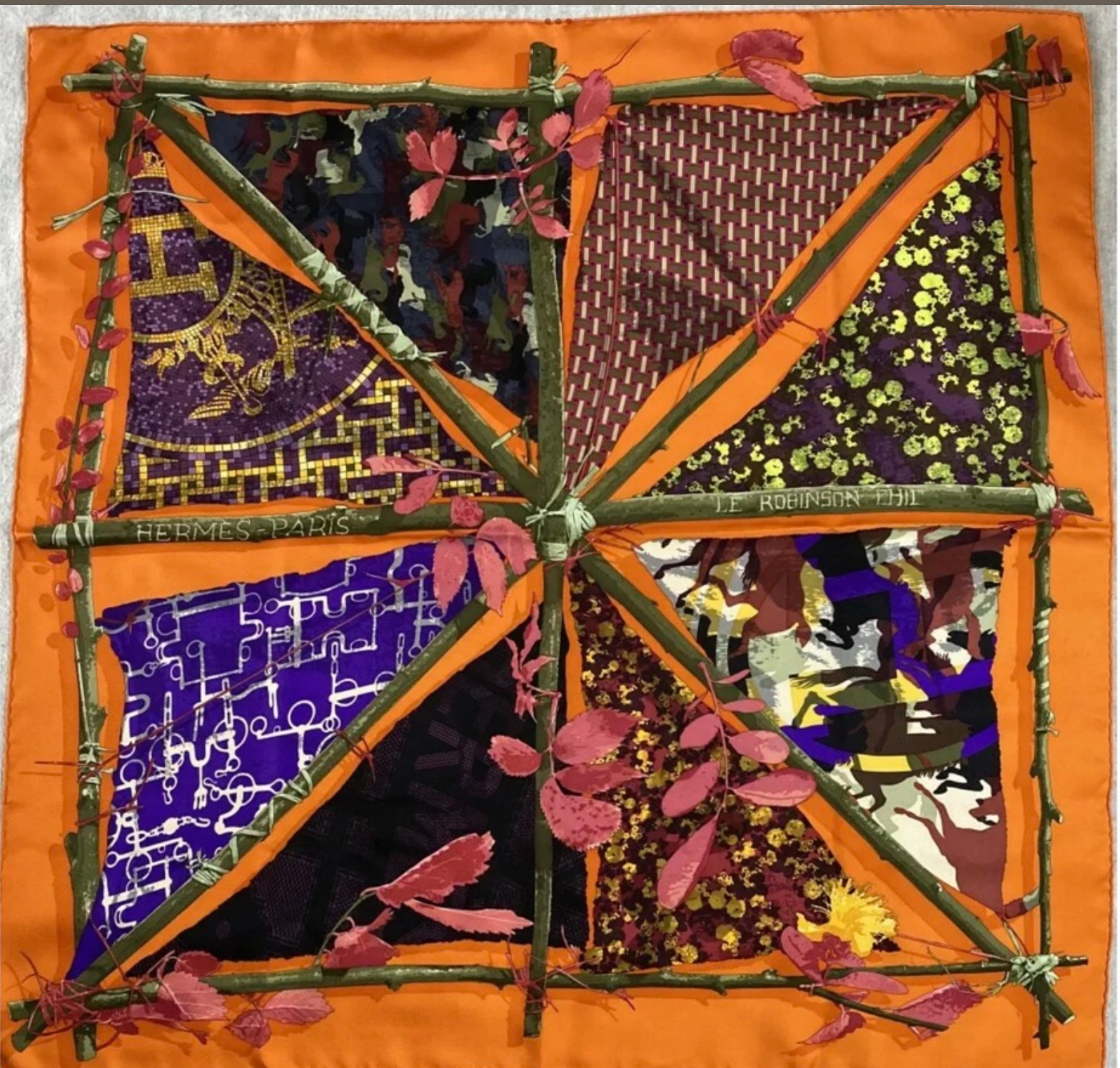 Here Robinson Crusoe was undoubtedly a poet, a deeply aesthetic poet, but did he know how to forget time? Or, rather, to "take hold" of it, abandoning watches, clocks and calendars? Was he able to let himself be overtaken by a contemplation of nature, learning to delve into it to the point of realising that he and it were one? On deserted islands nothing disturbs nature that didn't originate in it. Seven or eight branches, a bit of string and a few pieces of cloth and a sail is made. It's a strange sail of course, but so chic! Mosaique au 24, Ex-Libris en camouflage, Collection equestre, Hermes sellier...what beautiful silk to protect you from the sun and lead you away!